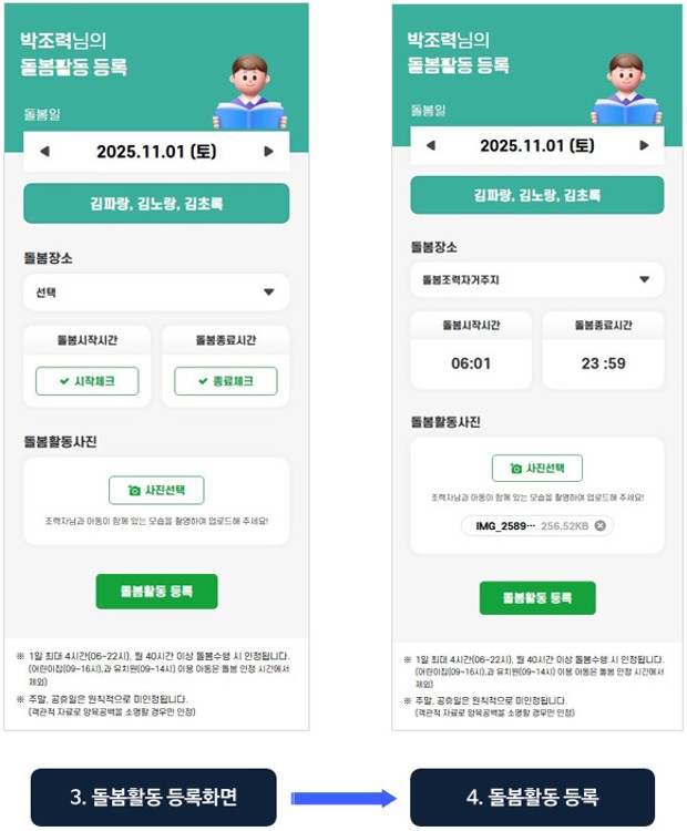 - 돌봄활동 시작 전 교육 수료증 미제출 시 돌봄활동 등록이 불가능하오니 유의하시기 바랍니다.
