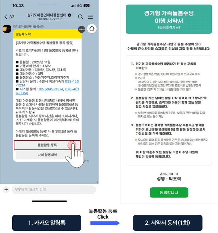 1) 돌봄활동 시 수신된 알림톡에서 [돌봄활동 등록] 버튼을 클릭해 주세요.