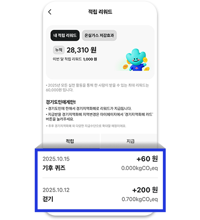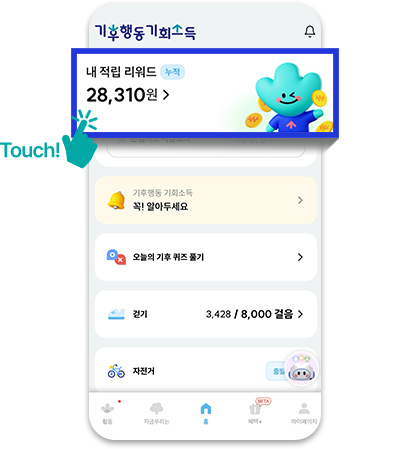 참여 방법 기후행동 기회소득 APP(앱)에서 16가지 활동 중 1개 이상 (1회 이상) 참여하신 내역을 이벤트 인증폼에 제출해 주세요. 날짜별, 활동별로 여러 번 응모 가능합니다. 예시1 10월21일 걷기 활동 + 10월 21일 기후퀴즈 활동 → 2회 인증 예시2 10월21일 걷기 활동 + 10월 22일 걷기 활동 → 2회 인증 [홈 - 내 적립 리워드] 클릭 활동 내역 인증 동일한 사진으로는 1회만 이벤트 응모가능
