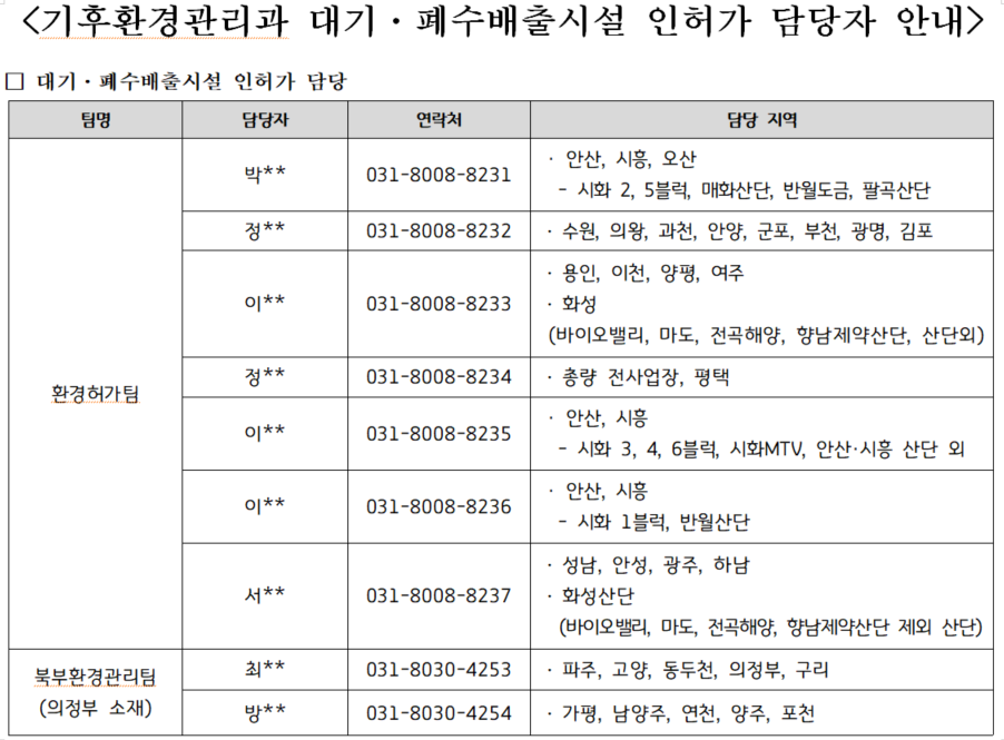 공지사항 홈 알림마당 공지사항 기후환경관리과 대기·폐수배출시설 인허가 담당자 안내('25.08.12. 기준) 게시물 정보 작성자 광역환경관리사업소 첨부파일 기후환경관리과 인허가 담당_홈페이지 게시용.hwpx 바로보기 바로듣기 목록보기 다음글 「2024 깨끗한 산업단지 가꾸기」 시범사업 추진에 따른 수요조사 이전글 환경오염행위 신고 포상개선!! 적극적으로 신고해 주세요!!