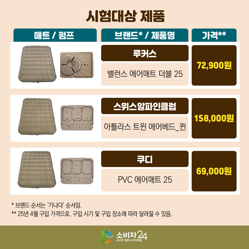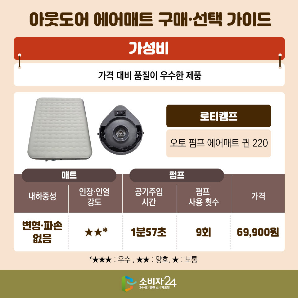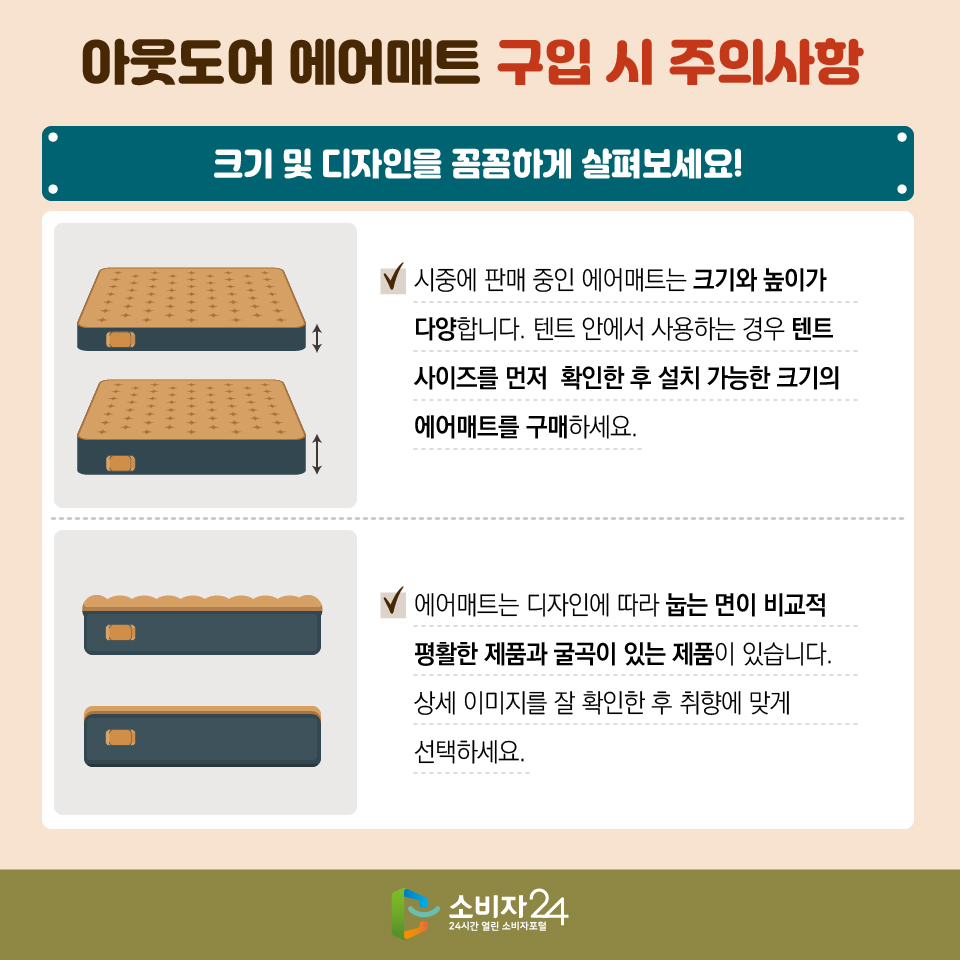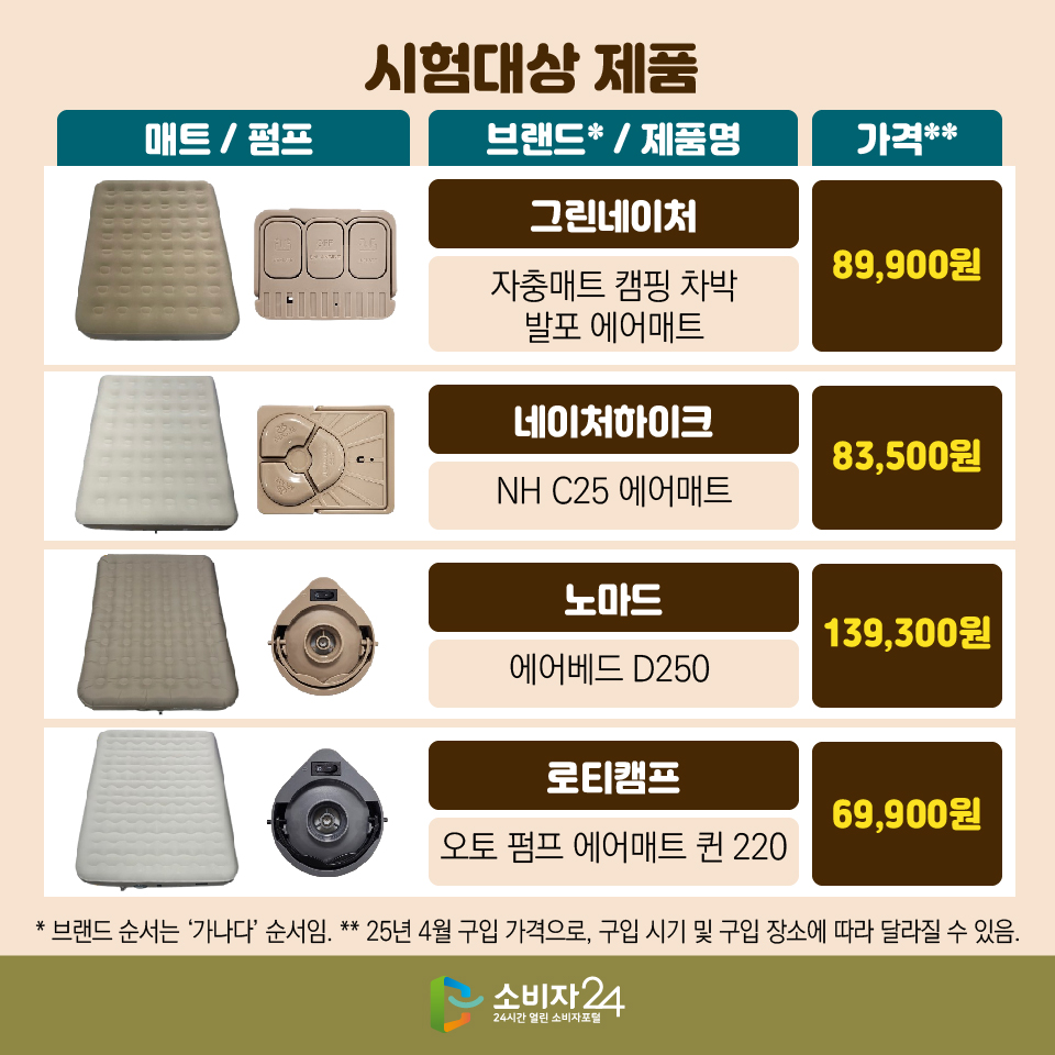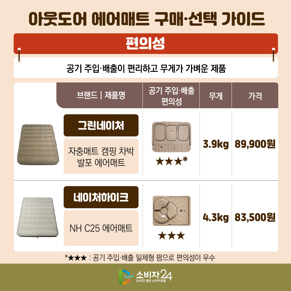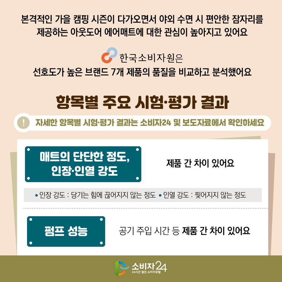 카드뉴스 홈 소비자정보 카드뉴스 아웃도어 에어매트 품질비교 결과, 캠핑용 에어매트의 내구성과 내장 펌프, 제품 간 성능 차이 있어요 게시물 정보 작성자 공정경제과 목록보기 다음글이 없습니다. 이전글 소형 식기세척기 품질비교 결과, 건조성능·작동시간 등에 차이 있어 꼼꼼히 확인하고 선택해야 해요
