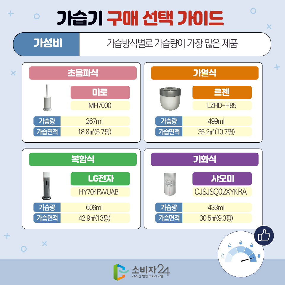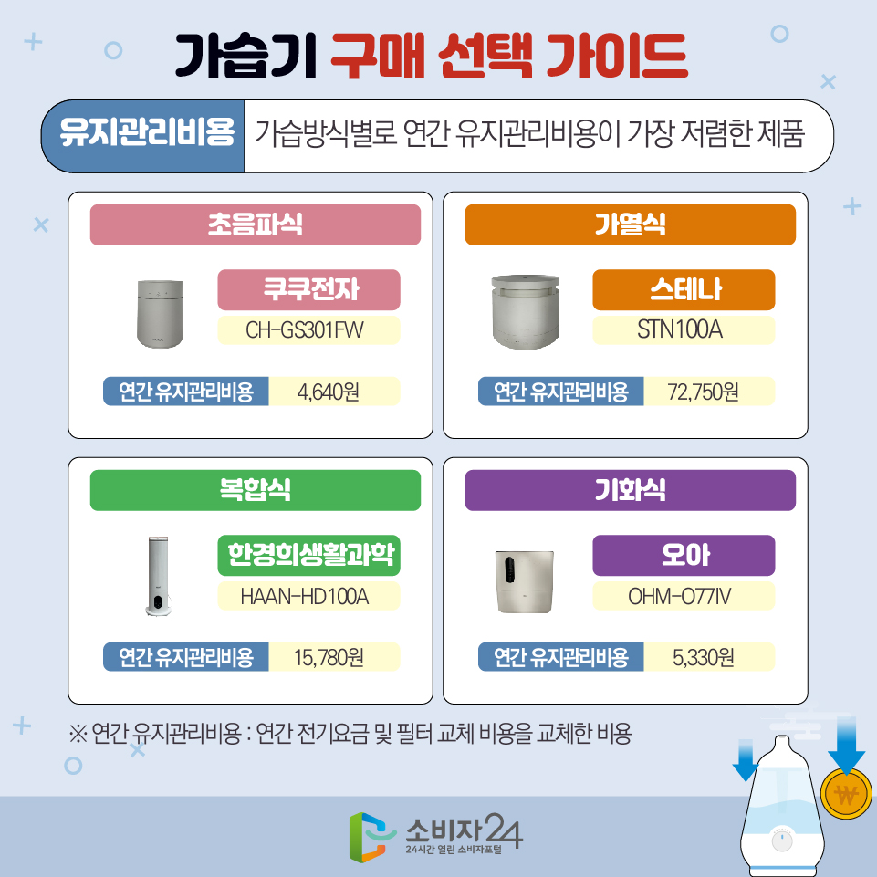 카드뉴스 홈 소비자정보 카드뉴스 가습기 제품·가습방식에 따라 가습량, 유지관리비용, 소음 등에 차이 있어요 게시물 정보 작성자 공정경제과 목록보기 다음글 에너지 스틱 품질비교 결과, 제품별 함유 성분 차이 있어 운동 유형에 맞게 선택해야해요 이전글 바디워시 피지 세정력 전 제품 우수, 미세먼지 세정력은 차이 있어요