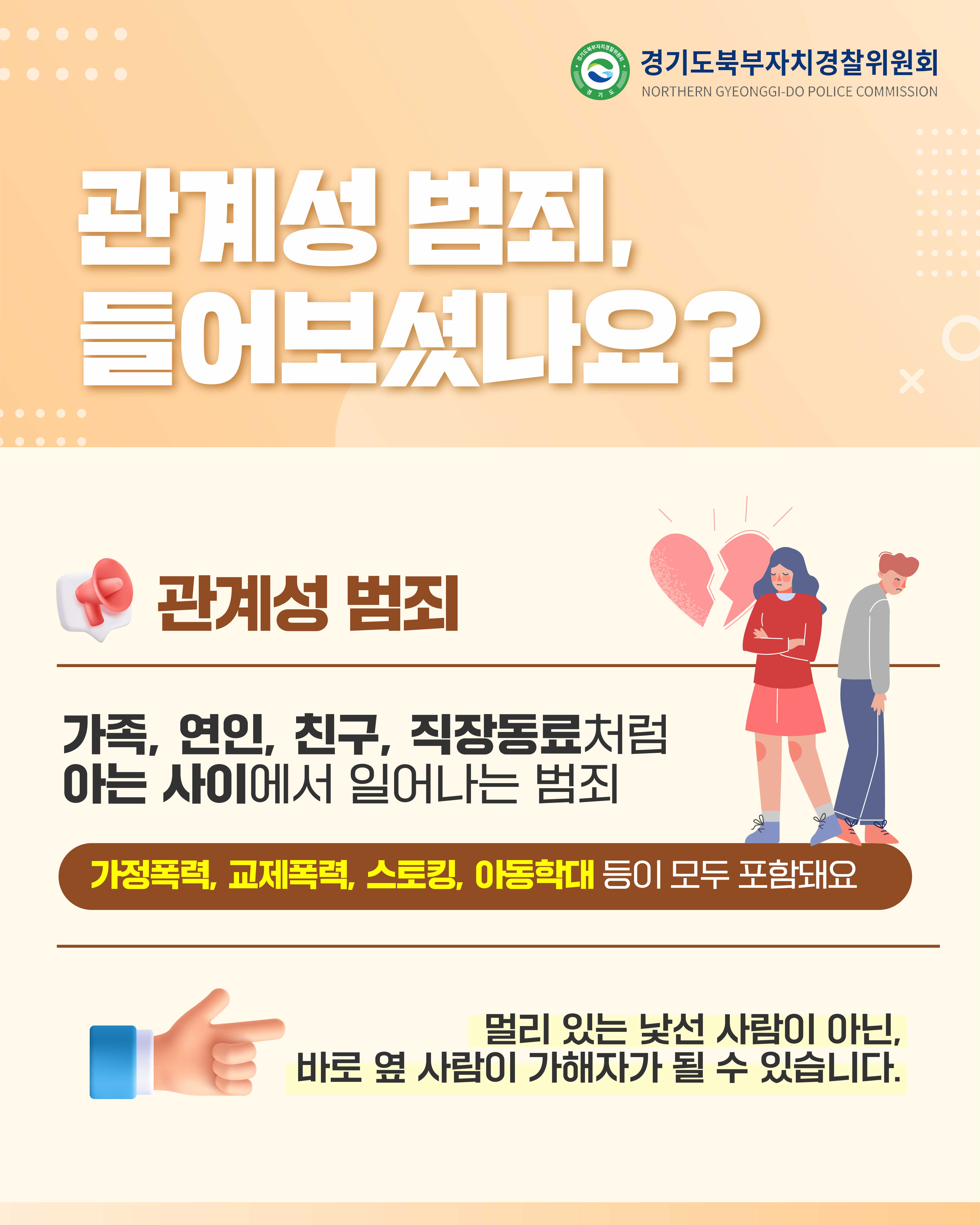 홍보자료 홈 알림마당 홍보자료 [카드뉴스]숨겨진 폭력, 관계성 범죄를 아시나요? 게시물 정보 작성자 북부자치경찰위원회 목록보기 다음글이 없습니다. 이전글 [카드뉴스]픽시자전거, 멋보다 안전이 먼저!