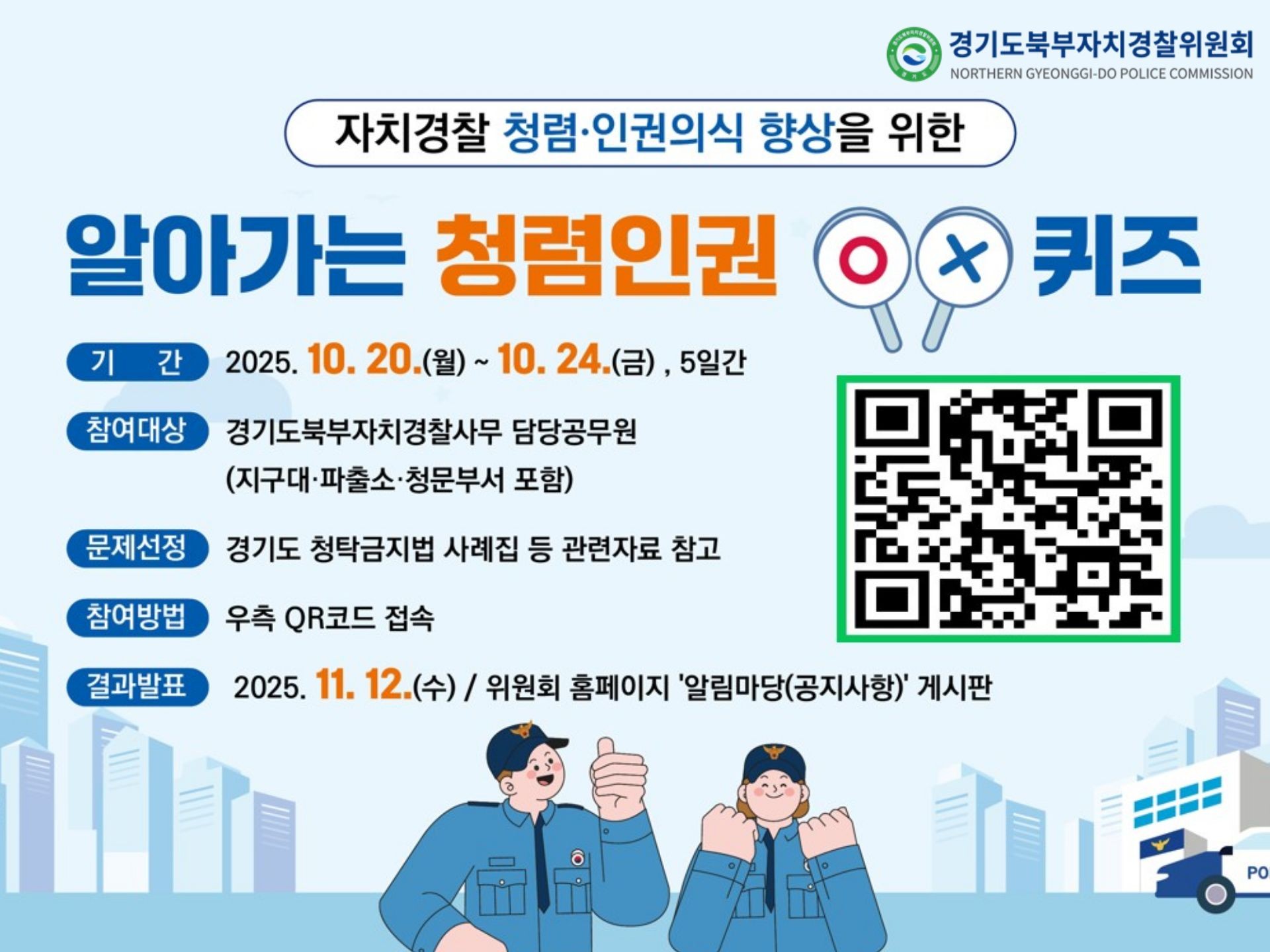 공지사항 홈 알림마당 공지사항 자치경찰 청렴 의식 향상을 위한 알아가는 청렴인권 O,X 퀴즈 게시물 정보 작성자 북부자치경찰위원회 목록보기 다음글이 없습니다. 이전글 2024년 경기도북부자치경찰위원회 차량 보유 및 운영관리 현황 공개