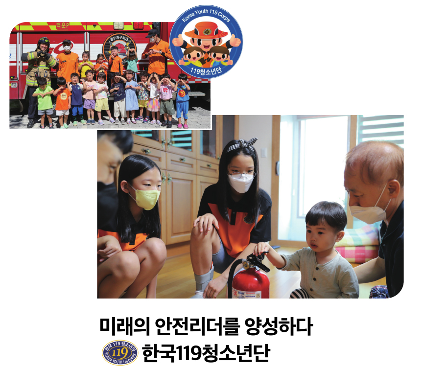 한국119청소년단은 소방안전과 관련된 청소년 단체로, 청소년이 올바른 안전의식을 배우고, 실천하는 습관을 통하여 우리의 일상생활에 소방안전에 대한 의식이 바르게 자리잡을 수 있도록 다양한 프로그램을 운영하는 단체입니다. 1963년 ‘어린이소방대’로 시작하여 해마다 2~3만 명 이상의 학생이 활동하고 있습니다.