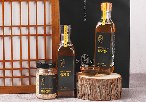 첨가물 없이 100% 국산 참깨·들깨만을 사용해 재료 본연의 향과 영양을 살린 정직한 기름. 저온압착 방식으로 한 번만 착유해 맑고 신선하다.