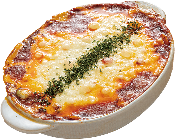그라탱 그릇에 재료를 옮겨 담고 슬라이스 치즈와 모차렐라 치즈를 올린다.