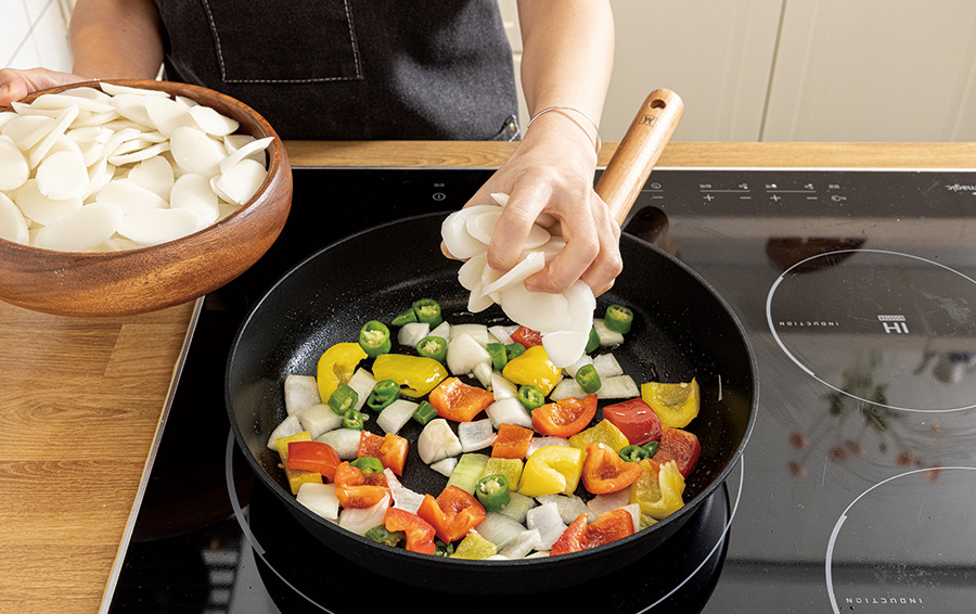 양파가 투명해지면 떡국떡을 넣어 볶는다.