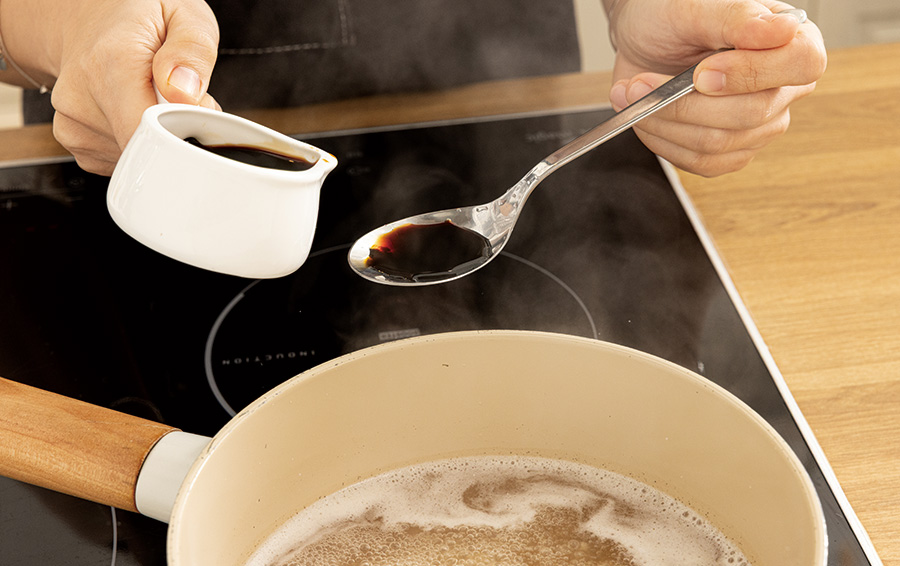 물이 끓으면 코인 육수와 다진 마늘, 국간장을 차례로 넣는다.