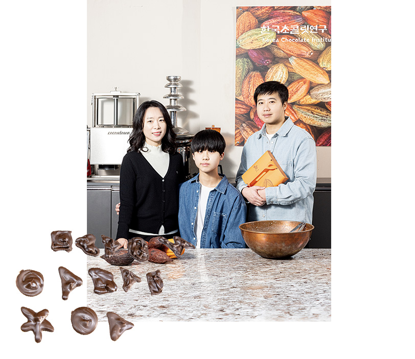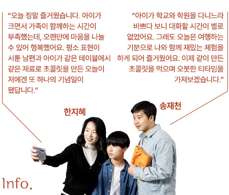 남편 송재천 씨, 아들 송민준 군과 함께 가평 한국초콜릿연구소뮤지엄에서 초콜릿을 만든 하루. 녹인 다크 초콜릿에 부드러운 생크림을 넣어 열심히 젓고, 또 짤주머니를 이용해 여러 모양의 초콜릿을 만들며 가족은 서로 한곳을 바라보는 몰입의 시간을 가졌다. 특히 하트, 별, 눈 등 다양한 초콜릿을 만들 때 송재천·한지혜 씨 부부는 민준 군이 어릴 적 같이 하던 색칠 놀이가 떠올랐단다. 여전히 눈에 넣어도 아프지 않은 아들이지만, 그 사랑을 표현하는 시간이 점점 줄어들던 가족에게 이날은 너무나도 달콤한 하루였다.