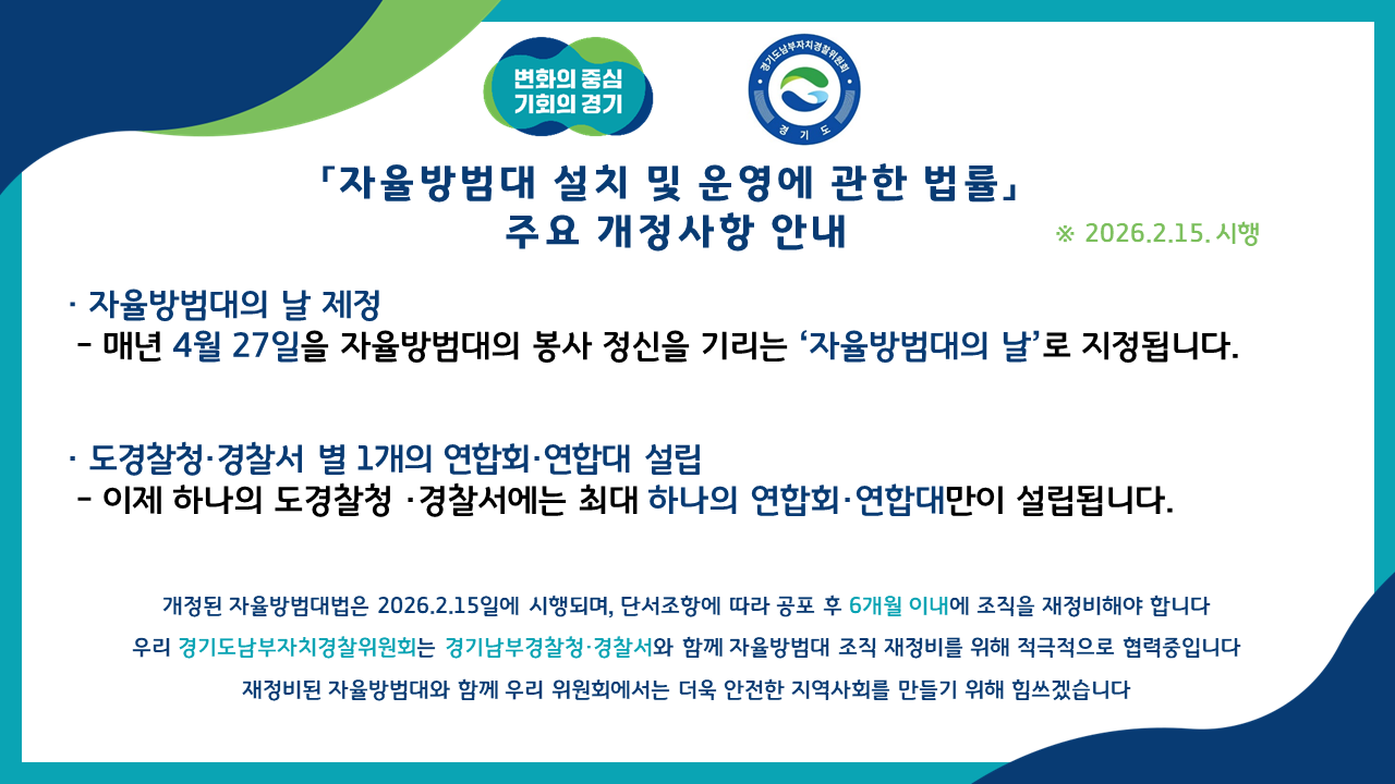 우리 경기도남부자치경찰위원회에서는 개정된 자율방범대법에 맞게 자율방범대 조직을 정비하기위해 경기남부경찰청, 각 경찰서들과 적극 협력중입니다.
