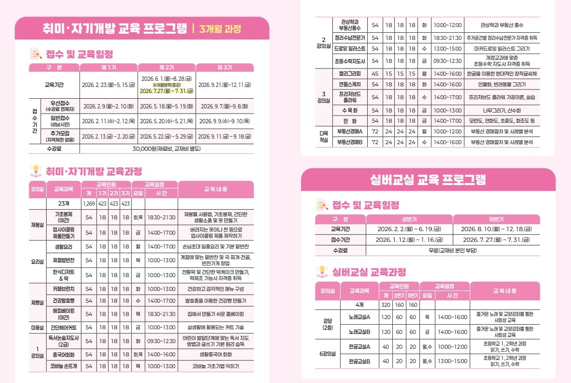 경기도여성기관 소식·홍보 홈 여성소통 경기도여성기관 소식·홍보 성남시여성플러스센터 수강생 모집 안내 (~9.18) 게시물 정보 작성자 여성비전센터 ※ 기수•자격에 따라 모집 기간이 다르므로 확인 부탁드립니다. ※ 자세한 내용 및 수강신청은 https://learning.seongnam.go.kr/index.do (성남시 평생학습 통합플랫폼-배움숲) 참고 부탁드립니다 첨부파일 성남여성플러스센터 수강생 모집.xlsx 바로보기 바로듣기 목록보기 다음글 광명시여성비전센터 수강생 모집 (마감) 이전글 안산여성인력개발센터 수강생 모집 안내 (~12.31) 이 게시물은 "공공누리 제 3유형(출처표시 + 변경금지)" 조건에 따라 자유롭게 이용이 가능합니다.
